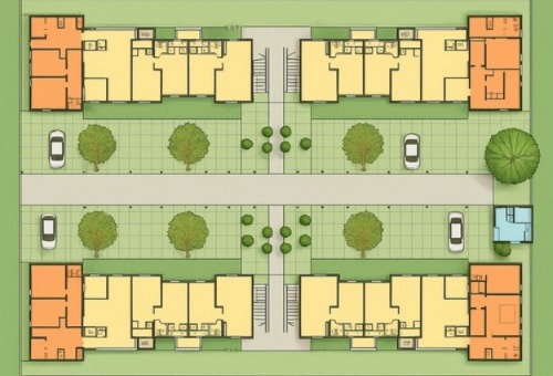 Esta planta de condomínio evidencia um projeto organizado, com circulação central bem definida, unidades distribuídas de forma equilibrada e áreas verdes estrategicamente posicionadas para trazer conforto ambiental. O desenho privilegia a convivência, a boa ventilação, a iluminação natural e o acesso seguro de pedestres e veículos. Um exemplo de planejamento urbano que valoriza praticidade, harmonia e qualidade de vida.